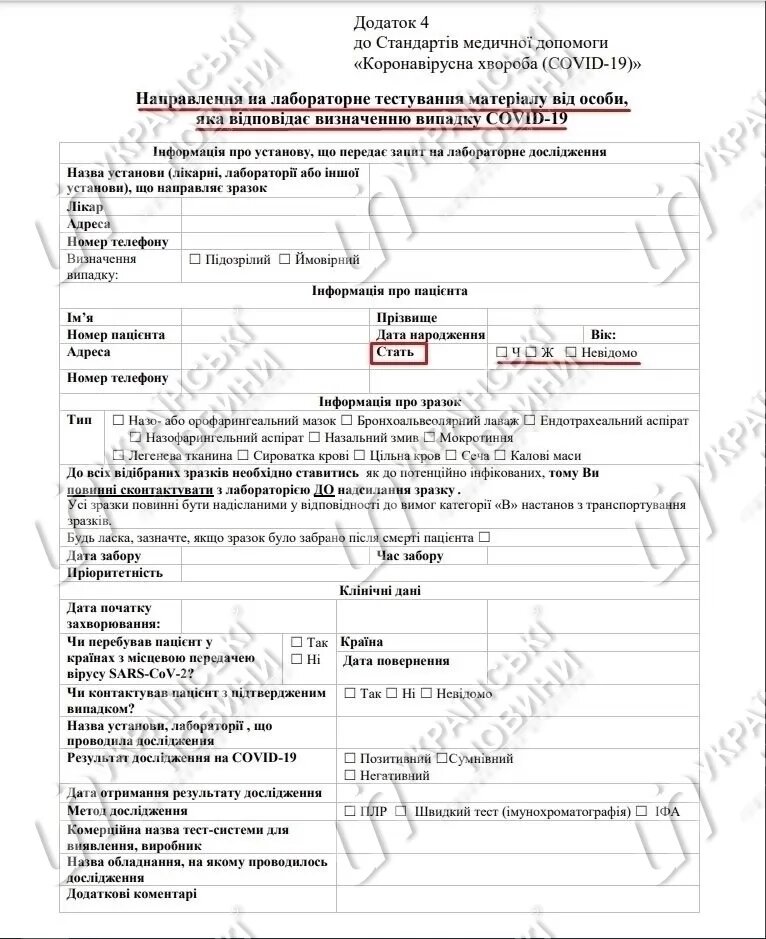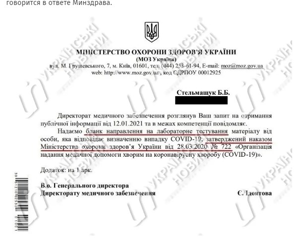 "Надаємо бланк направлення на лабораторне тестування матеріалу від особи, відповідної визначенню випадку COVID-19, затверджений наказом Міністерства охорони здоров'я України від 28.03.2020 №722 "Організація надання медичної допомоги хворим коронавірусною хворобою (COVID-19)", - відповіли журналістам у МОЗ на запит.