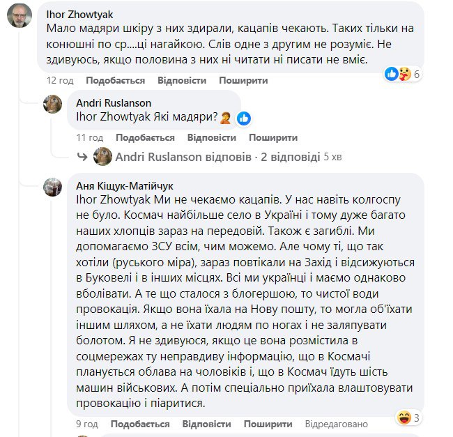 "Якщо вона їхала на Нову пошту, то могла об'їхати іншим шляхом, а не їхати людям по ногах і не заляпувати болотом. Я не здивуюся, якщо це вона розмістила в соцмережах ту неправдиву інформацію, що в Космачі планується облава на чоловіків і, що в Космач їдуть шість машин військових", - переконана місцева жителька.