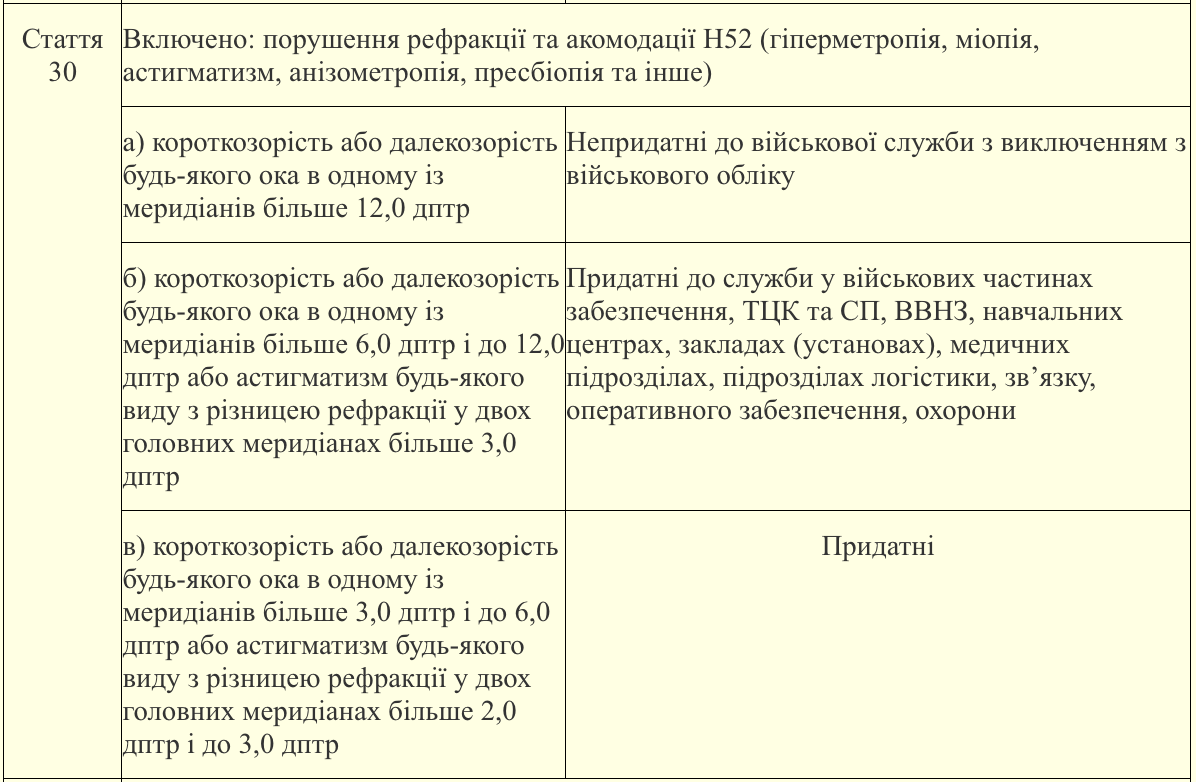 Стаття 30-б ВЛК Придатні до служби у військових частинах забезпечення, ТЦК та СП, ВВНЗ, навчальних центрах, закладах (установах), медичних підрозділах, підрозділах логістики, зв"язку, оперативного забезпечення, охорони, належать: короткозорість або далекозорість будь-якого ока в одному із меридіанів більше 6,0 дптр і до 12,0 дптр або астигматизм будь-якого виду з різницею рефракції у двох головних меридіанах більше 3,0 дптр