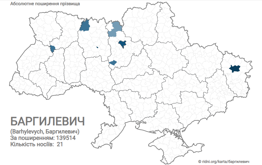 З прізвищем Баргилевич ситуація трохи краще, аніж з попередником, адже воно налічує вже 21 носіїв й відповідно за поширенням займає 139514 місце. Найчастіше зустрічається на Слобожанщині.