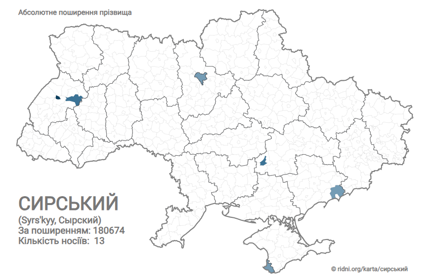 Як виявилося, прізвище Сирський досить рідкісне на теренах нашої країни, оскільки налічує усього 13 носіїв. За поширенням воно займає 180674 місце.