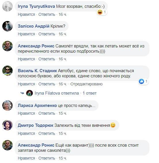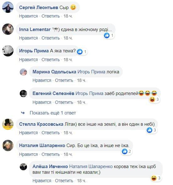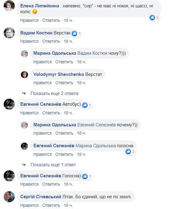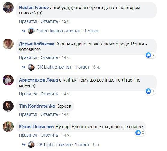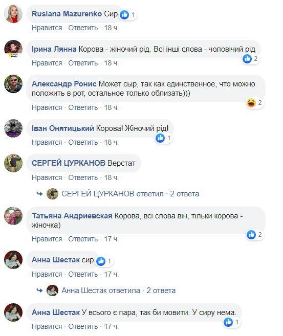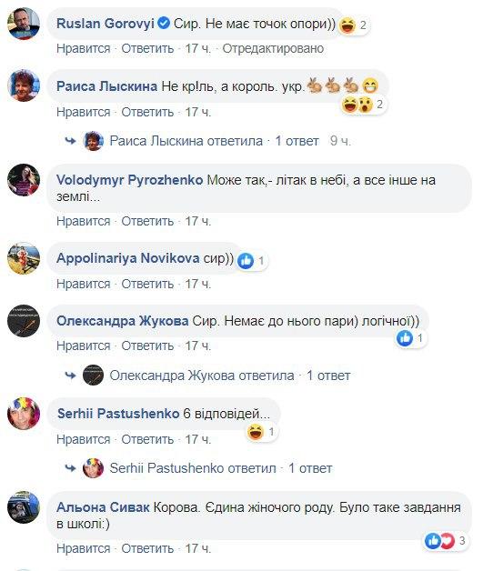 "Напевно "сир" - не має ні ніжок, ні шассі, ні коліс", "Сир. Бо це їжа, а інше не їжа", "Корова - жіночий рід. Всі іні слова - чоловічий рід", "Літак в небі, а все інше на землі", - пишуть вони.