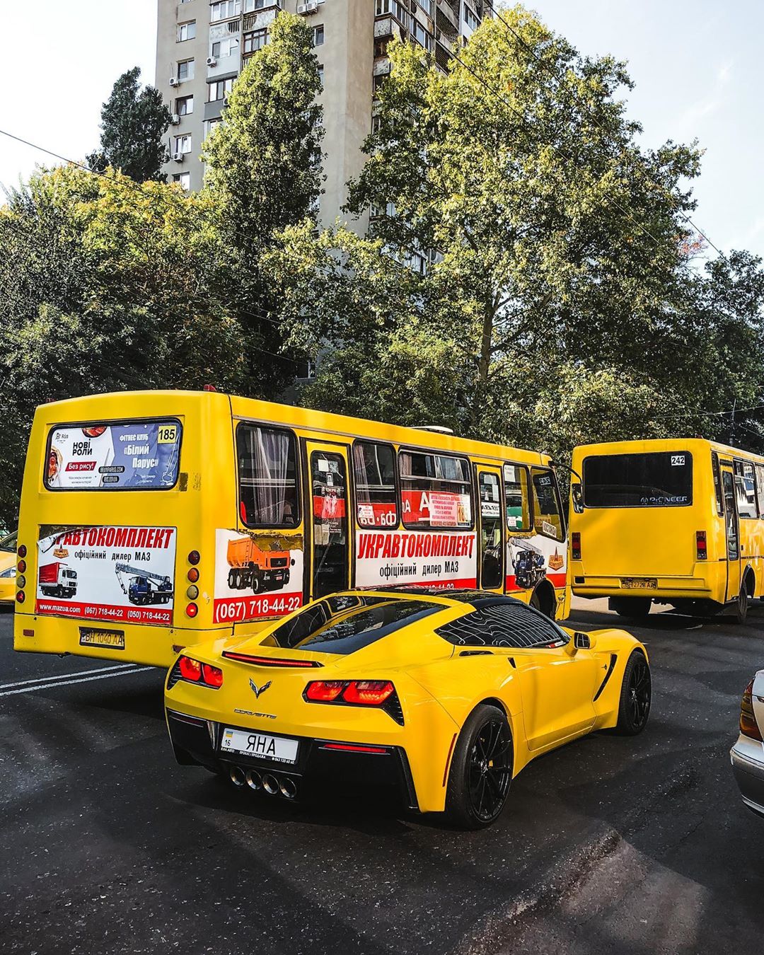 Корвет, вартістю близько $ 18,700, відображений на дорозі на тлі двох маршруток, причому за кольором він практично зливається з ними. На номерному знаку напис "Яна".