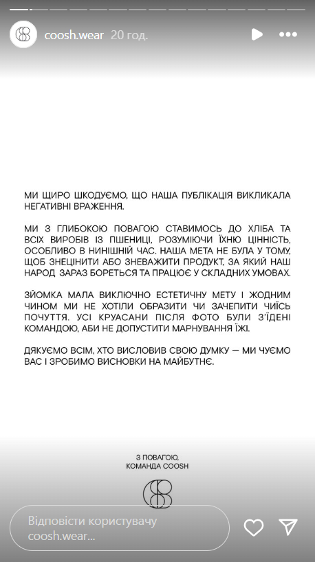 "Ми щиро шкодуємо, що наша публікація викликала негативні враження. Ми з глибокою повагою ставимося до хліба та всіх виробів із пшениці, розуміючи їхню цінність, особливо в нинішній час. Наша мета не була в тому, щоб знецінити або зневажити продукт, за який наш народ зараз бореться та працює у складних умовах. Зйомка мала виключно естетичну мету і жодним чином ми не хотіли образити чи зачепити чиїсь почуття".