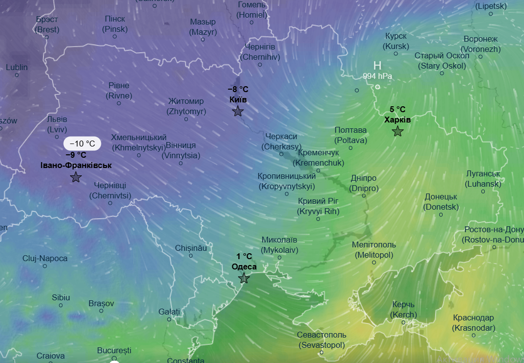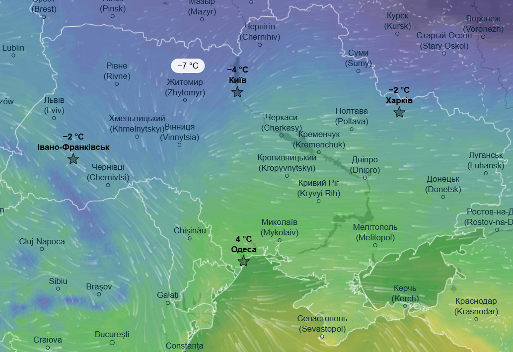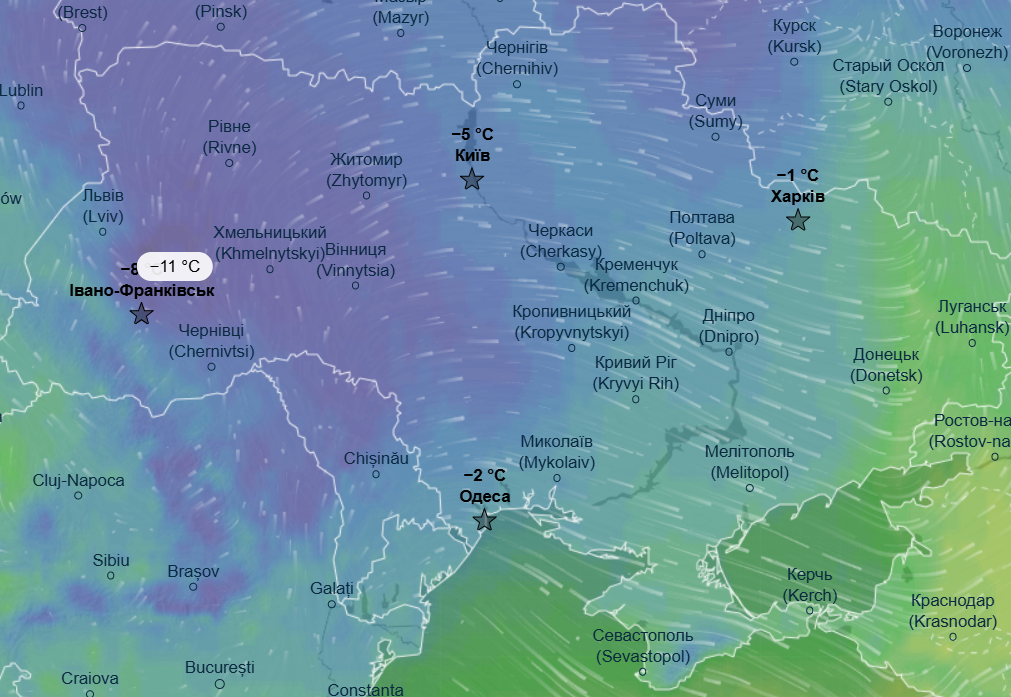В понеділок, 16 лютого, вночі західні області накриють морози в межах -9...-12 °С. Впродовж доби вони також поширяться на північні та частину центральних областей — вдень очікуєтьься від - 3 до -10 °С. На півдні та на сході країни ще триматиметься відлига до +2°С.
