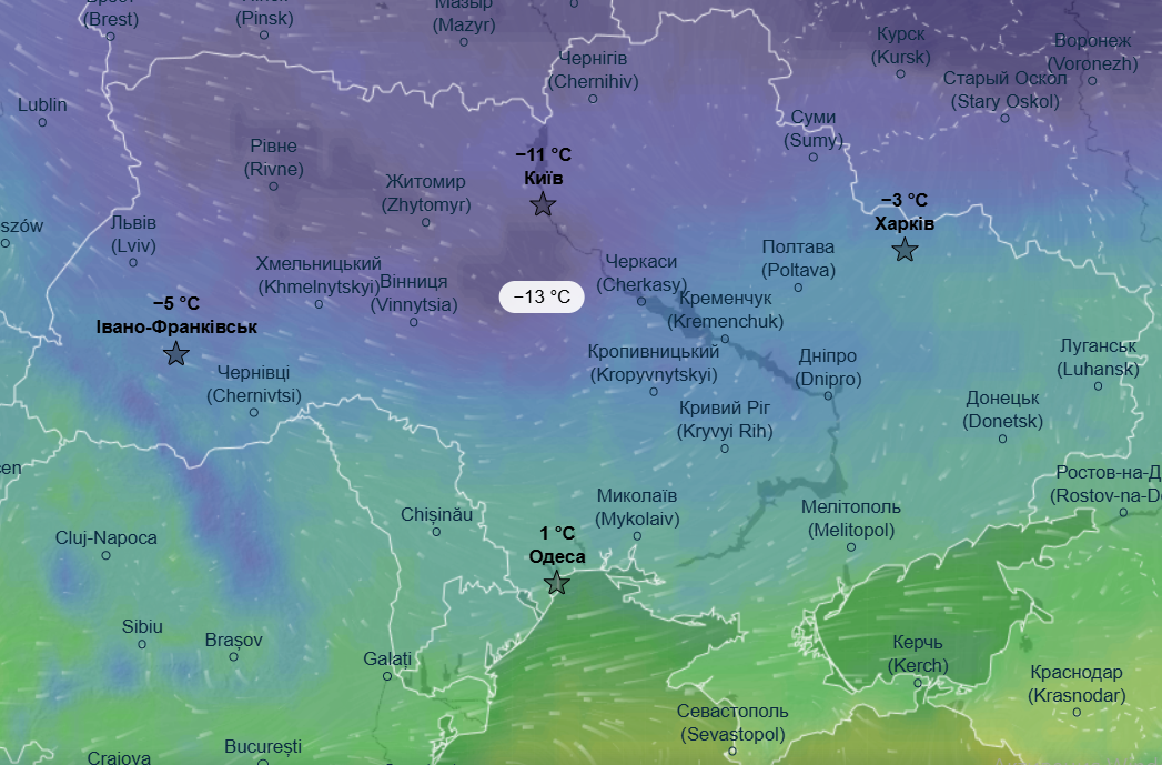 У вівторок, 17 лютого, морози в межах -10...-13 °С поширяться на західні, північні та центральні області, епіцентром холодів буде Рівненщина, Житомирщина, Київщина та Черкащина. На решті території України очікуються невеликі морози в межах 0...-1 °С.