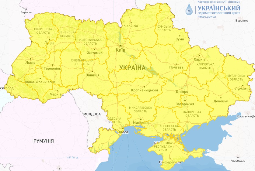 Метеорологи попереджають про І рівень небезпечності, жовтий.