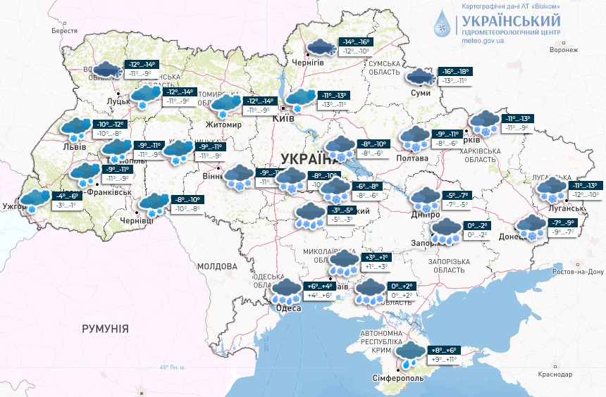 Температура - від 4° тепла до 1° морозу, вдень в Криму 7-12° тепла. У північних, Волинській та Рівненській областях місцями невеликий сніг; температура вночі 11-16°, вдень 8-13° морозу (в Чернігівській та Сумській областях вночі 15-20°, вдень 10- 15° морозу). На решті території складні погодні умови: помірний сніг, у центральних та східних областях значний сніг, хуртовина, пориви вітру 15-20 м/с; температура вночі та вдень 5-10° морозу. Вітер північно-східний, 7-12 м/с, в більшості західних, північних та південних областей місцями пориви 15-20 м/с. На дорогах ожеледиця.