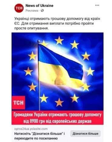 Шахраї адаптували стару схему обману під актуальні події в Україні. Користувачам Facebook обіцяють дати 8900 грн "допомоги від ЄС" за проходження опитування, використовуючи крадене брендування ТСН, прапори України та Євросоюзу.
