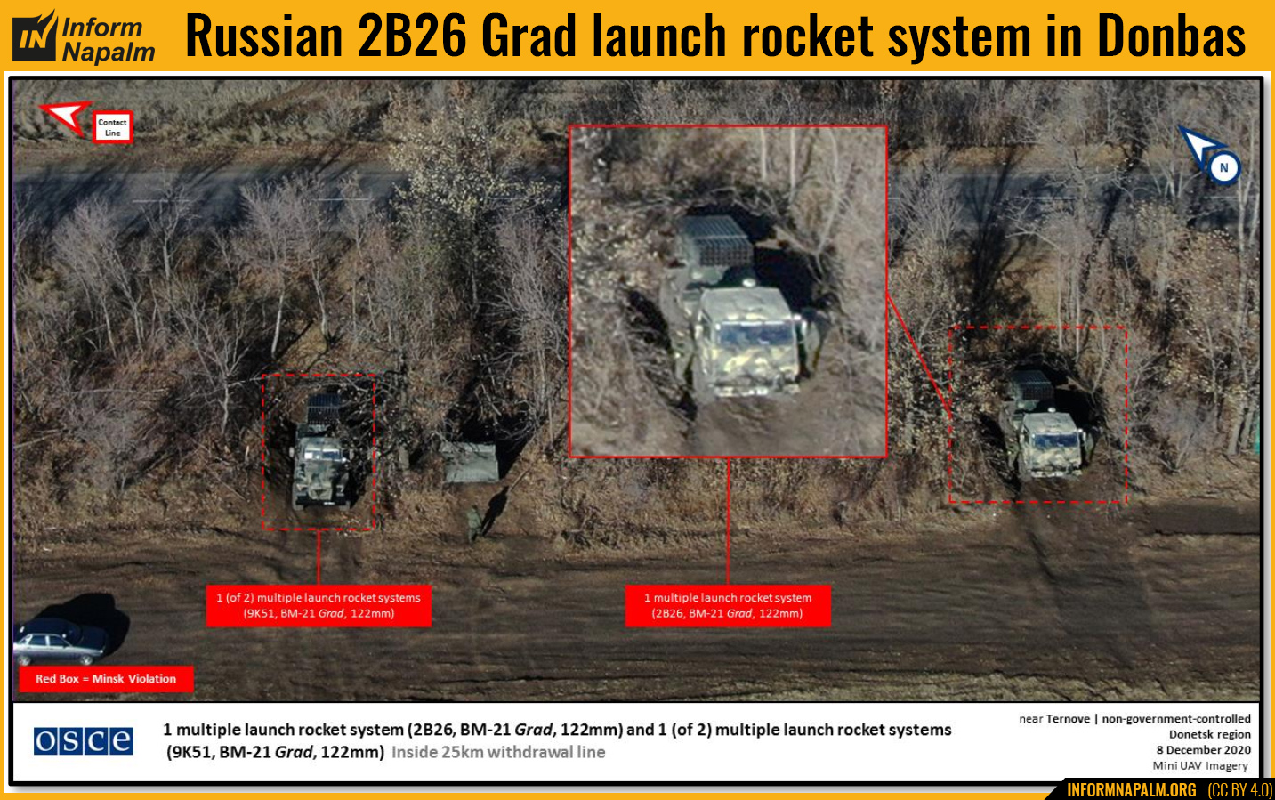 У повідомленні говориться, що РСЗВ 2Б26 "Град" було помічено з міні-БПЛА наглядової місії 8 грудня біля населеного пункту Тернове (Донецька область), розташованому за 57 км на схід від тимчасово окупованого Донецька. У звіті спостерігачі відзначили, що цей тип озброєння розміщений з порушенням лінії відводу.