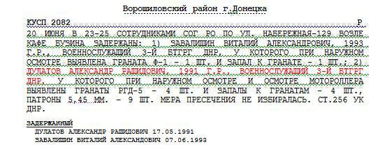 Згідно з інформацією, викладеною в мережу, Дулатова затримували влітку в кафе на окупованій території, при собі у нього було чотири гранати і патрони.