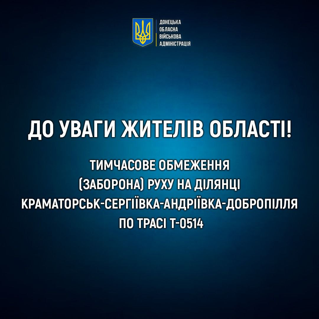 Від завтра 16 липня в Донецькій області вводять тимчасове обмеження для руху цивільних на ділянці автодороги Краматорськ-Сергіївка-Андріївка-Добропілля.