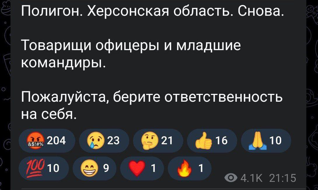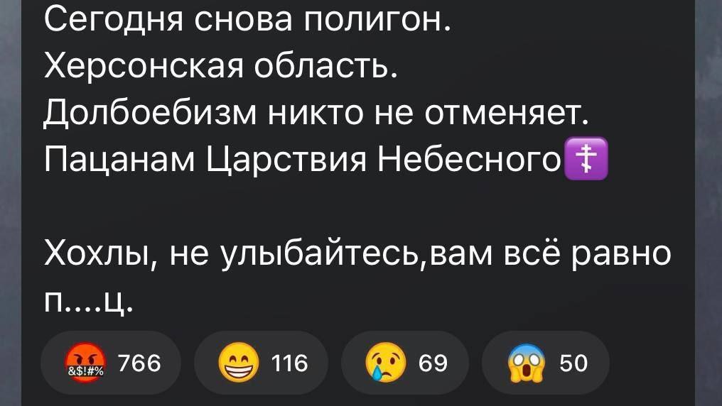 "Військкори повідомляють про черговий приліт по полігону у Херсонській області. Є загиблі. Тоді зрозуміло, чому х***и про Сальдо пишуть. Чекають на підтвердження чи спростування... Можливо, і він там був. На цьому полігоні", - пишуть у мережі російські Z-пропагандисти.
