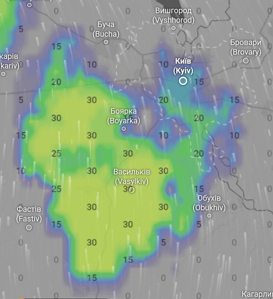 Згідно з радаром погоди, о 14:40 має початись дощ у Києві.