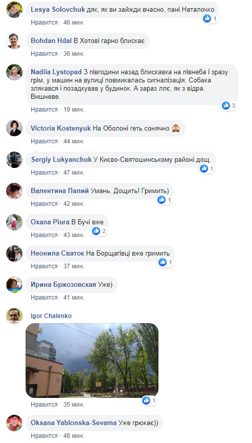 У коментарях до посту Діденко українці пишуть в яких районах Києва і де за містом вже гроза.