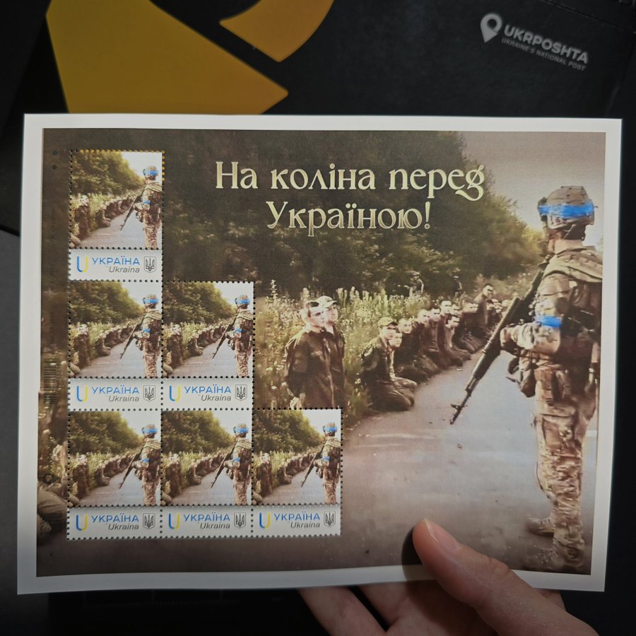 На фотографії можна помітити дизайн марок, тематично стилізований під події в Курській області, де Сили оборони взяли в полон російських військових. В центрі уваги на фотографії - російські полонені, котрі рядком стоять на колінах.