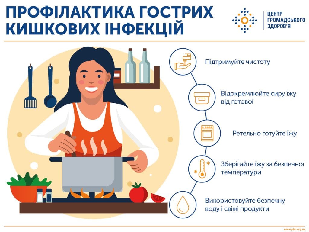 У центрі контролю та профілактики хвороб нагадують про симптоми гострої кишкової інфекції: загальна слабість, підвищення температури тіла, біль у животі, тошнота, блювота.