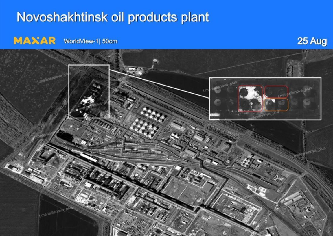 На Новошахтинському нафтопереробному заводі у Ростовській області РФ на шостий день приборкали пожежу, яка спалахнула після атака українських дронів у ніч на 21 серпня. Знищені шість резервуарів.