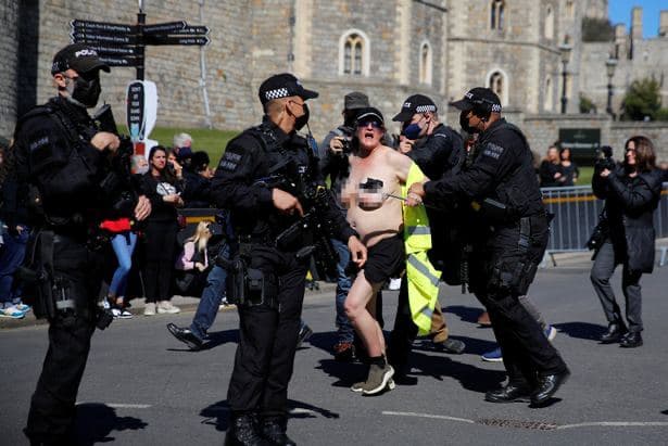 Напівоголена жінка намагалася прорватися до Віндзорський замок. Жінка була в кепці і окулярах, але без футболки і бюстгальтера. За той час, поки її намагалися зловити поліцейські, жінка встигла пробігти поруч біля стін замку і застрибнути на статую королеви Вікторії. Жінка викрикнула "врятуйте планету".