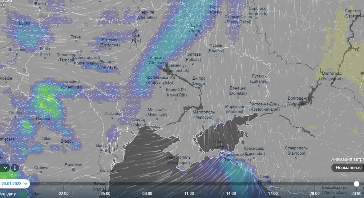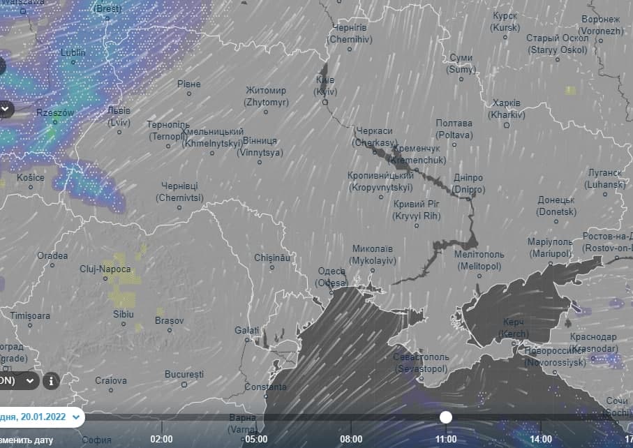 Далі атмосферний фронт зміститься на Схід. О 05:00 21 січня снігом засипатиме територію від Кременчука та Кропивницького до східних рубежів Луганської та Донецької області.