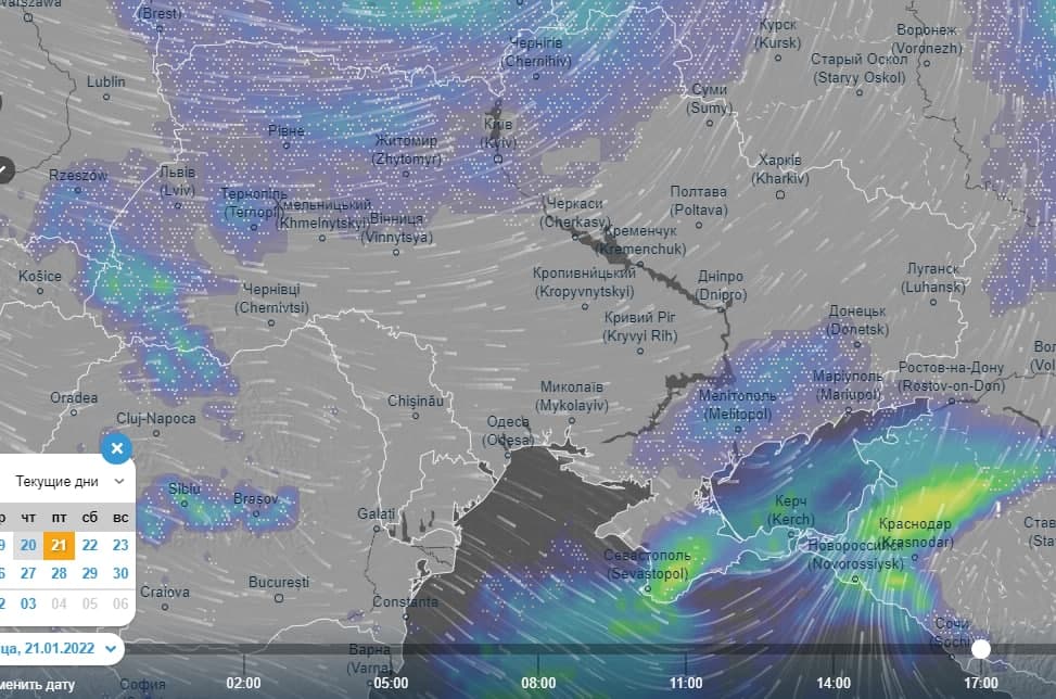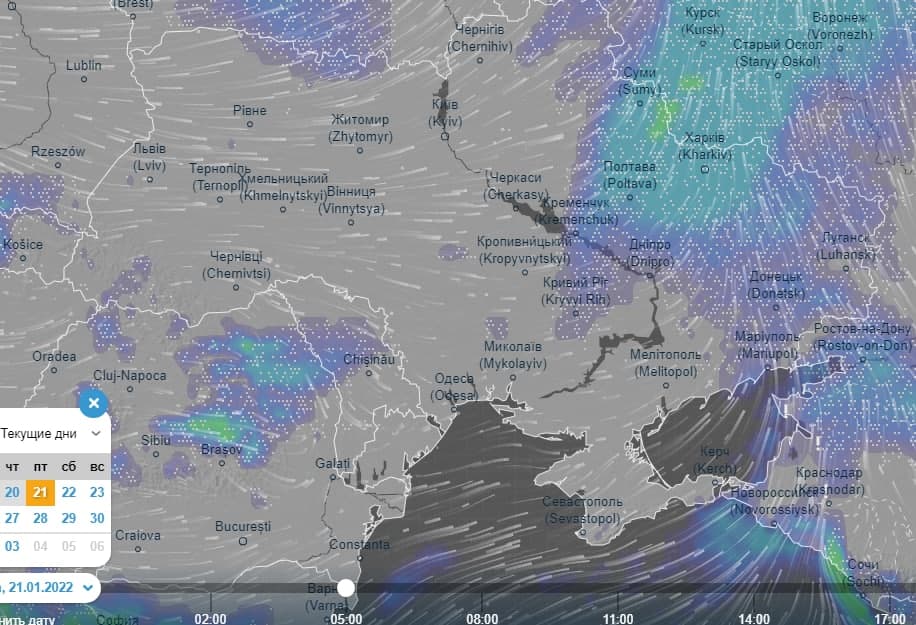 Ближче до вечора приблизно о 17:00 21 січня очікується сніг на заході та півночі України, а також на південному сході.