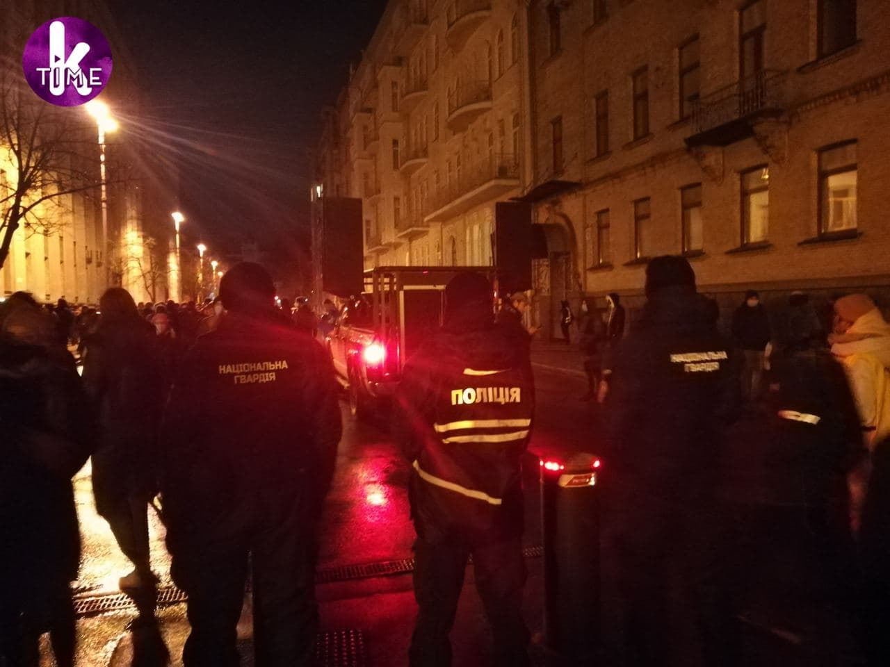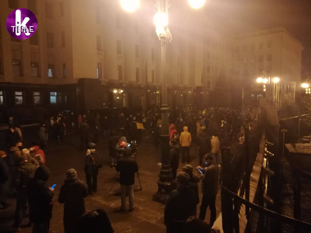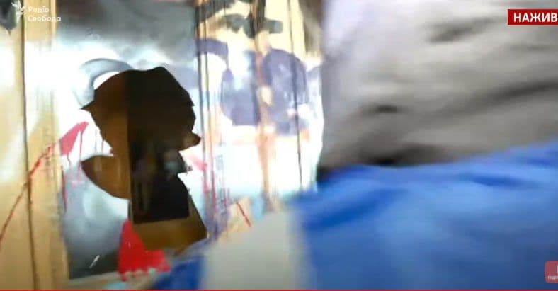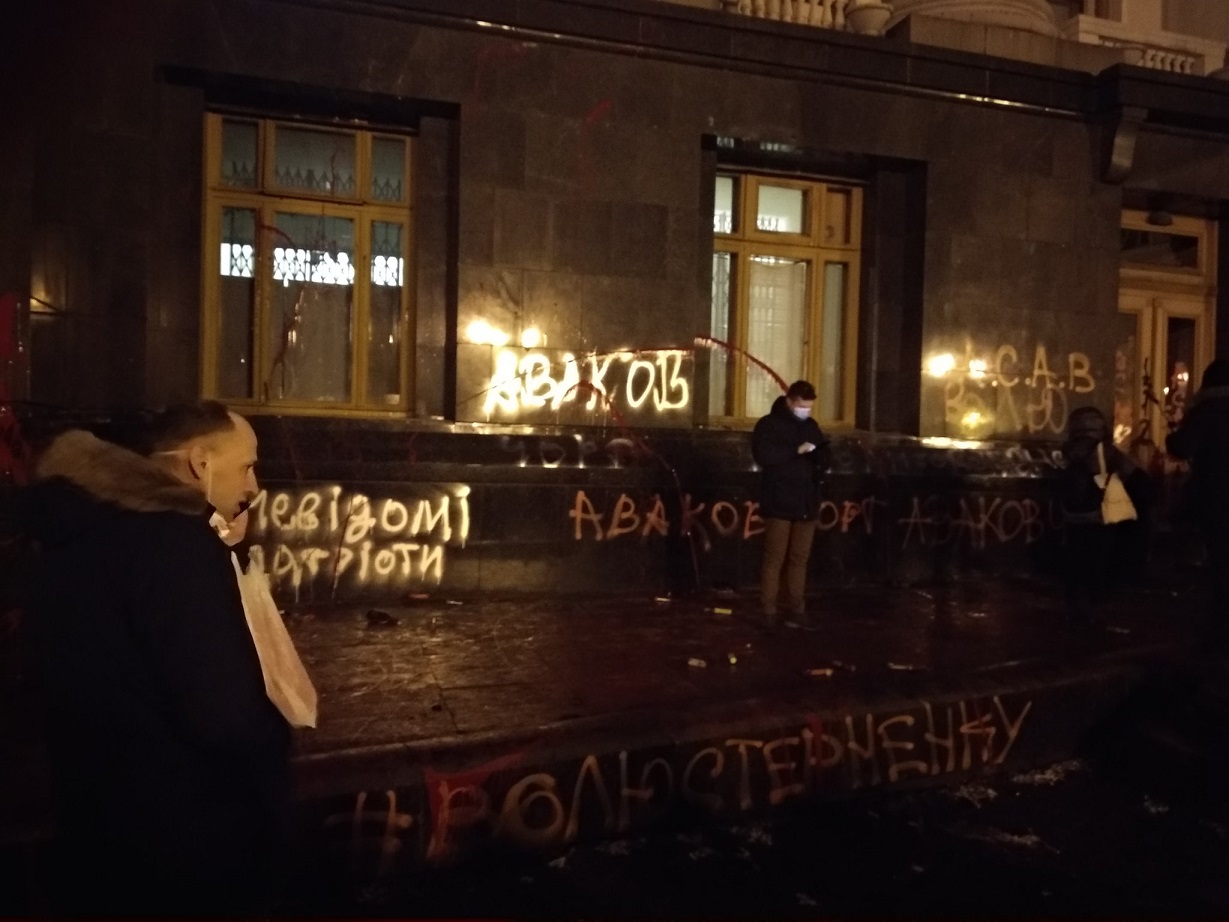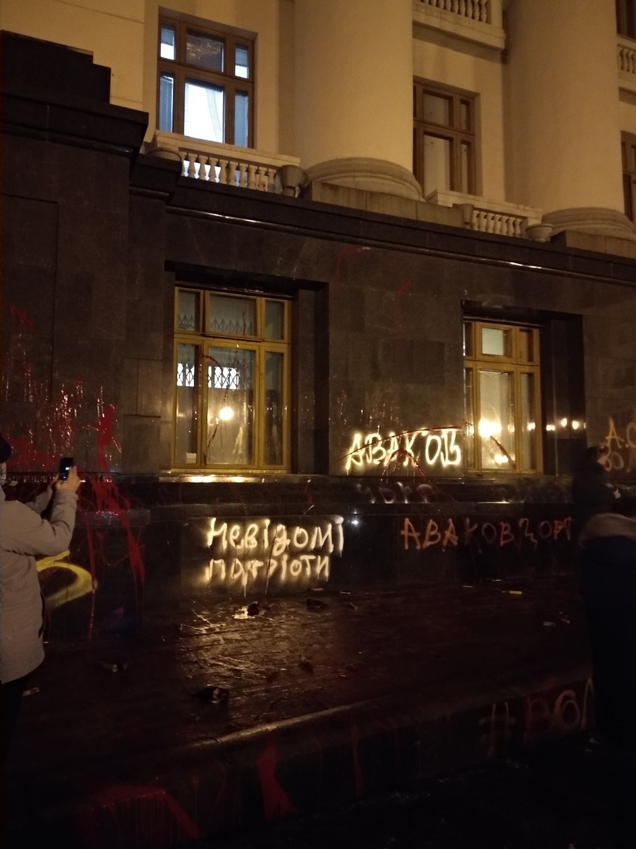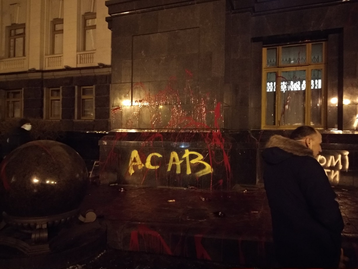 В сторону будівлі кидали піротехніку, на деяких вікнах утворилися тріщини. Врешті-решт вони підпалили табличку з написом "Президент України".