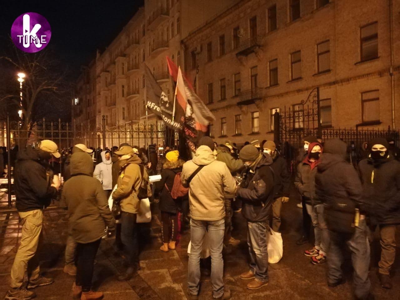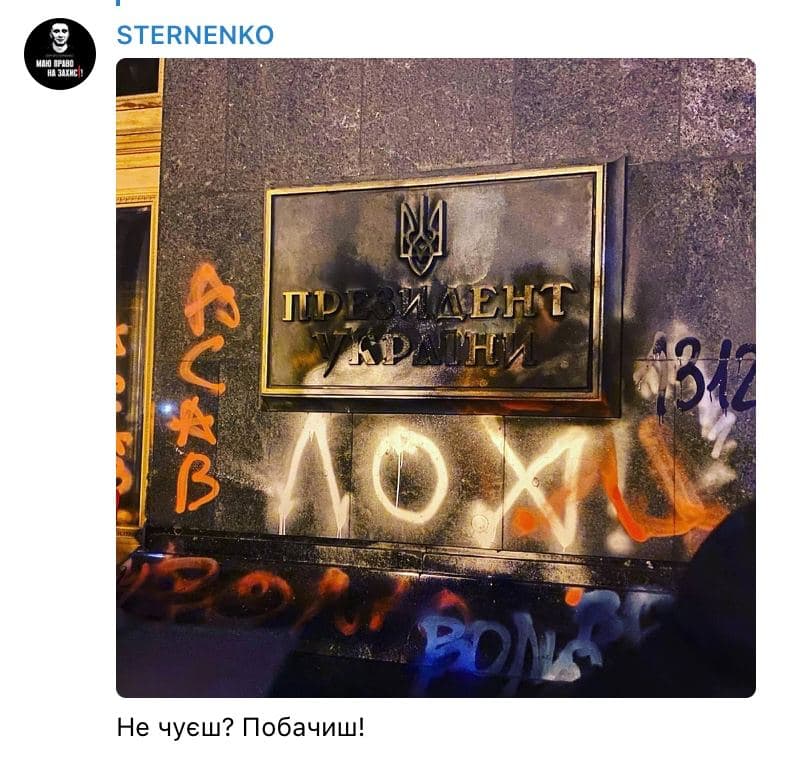 У суботу, 20 березня, учасники акції на підтримку засудженого за викрадення людини активіста Сергія Стерненка, який сьогодні відзначає свій день народження, палили фаєри біля Офісу президента України на вулиці Банковій, розмалювали стіни червоною фарбою і підпалили табличку з написом біля входу.