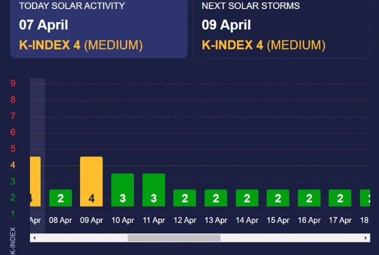 Найсильніша магнітна буря буде у вівторок, 9 квітня. Її сила досягне чотирьох балів за п'ятибальною шкалою. У цей день можливі збої в роботі стільникового зв'язку, GPS-навігації та електромереж. Людям із хронічними захворюваннями слід бути особливо уважними до свого здоров'я.