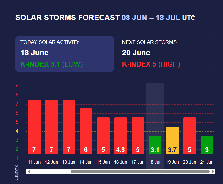 Відповідно до прогнозу експертів, 20 червня очікується сонячна активність з К-індексом 5 (червоний рівень), що відповідає сильній магнітній бурі. Варто зауважити, що експерти не дають довгострокового прогнозу коливань геомагнітного поля Землі, оскільки сонячна активність дуже мінлива і ситуація може змінюватися навіть до декількох разів на добу.