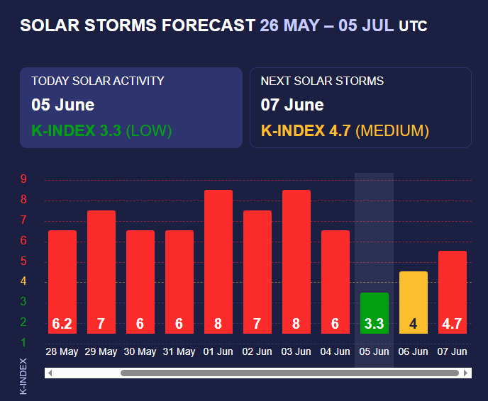 В кінці травня наша планета зазнавала впливу підвищеної активності на Сонці - Землю атакували магнітні бурі з індексами К 6, К 7 та К 8 (з 9 можливих), що є дуже високим. 5 червня ця затяжна буря ослабла, однак сонячний шторм може відновитися знову. Але варто звернути увагу, що усі прогнози вчених є попередніми, оскільки сонячна активність дуже мінлива і ситуація може змінюватися навіть до декількох разів на добу.