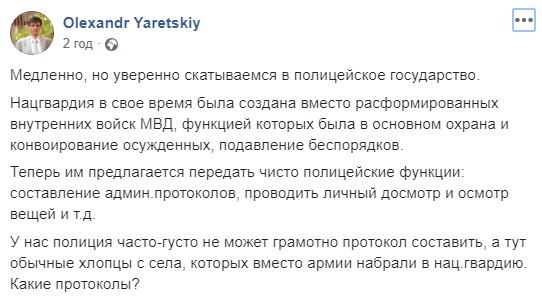 "Члени комітету розглянули проект закону про внесення змін до деяких законодавчих актів України щодо вдосконалення правових основ діяльності Національної гвардії України №3105. Один з авторів законопроекту, народний депутат Максим Павлюк зазначив, що цим проектом передбачається внести зміни до деяких законодавчих актів у частині посилення правоохоронних функцій Національної гвардії, а саме: щодо складання протоколів про адміністративні правопорушення, надання права проводити особистий огляд, огляд речей і т.д.", - йдеться в повідомленні.