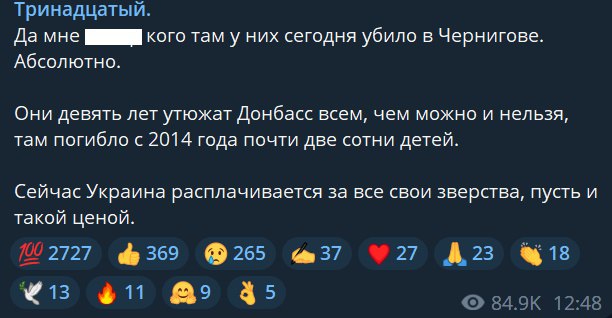У мережі з'явилася реакція росіян на удар по центру Чернігова, який стався сьогодні вдень, 19 серпня.