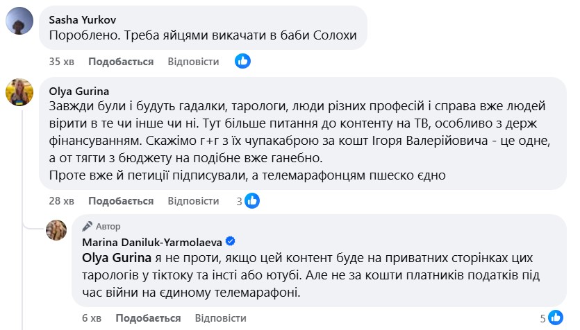 "На що йде 1,5 мільярди податків? На нові губи і бюсти екстрасенскиням", - написала у Facebook журналістка Марина Данилюк-Ярмолаєва.