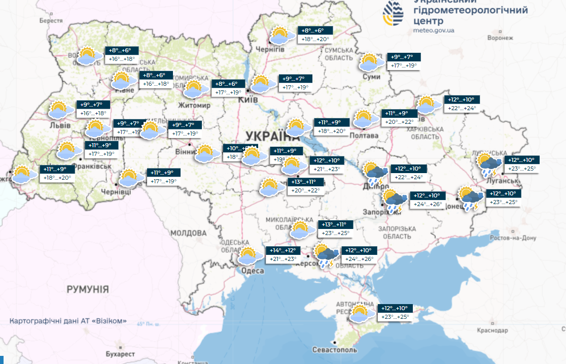 Передбачається, що великих дощів в Україні сьогодні не буде, короткочасні невеликі опади варто очікувати вдень лише в південних на східних областях. Температура в регіоні сягне 21-26° вдень та 10-12° вночі. Найтепліше сьогодні буде в Запорізькій та Херсонській областях з 26° тепла вдень.