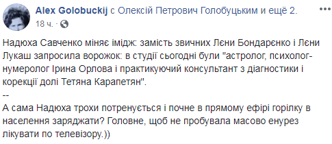 "Надюха Савченко змінює імідж: замість звичних Олени Бондаренко і Олени Лукаш запросила ворожок: в студії сьогодні були "астролог, психолог-нумеролог Ірина Орлова та практикуючий консультант з діагностики та корекції долі Тетяна Карапетян", - написав він.