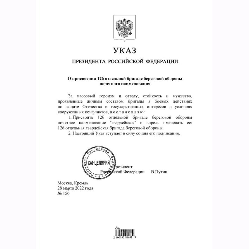 Путін присвоїв звання "гвардійських" двом бригадам своїх вояків - 126-й окремій бригаді берегової оборони (Чорноморського флоту) та 155-й окремій бригаді морської піхоти (Тихоокеанського флоту).