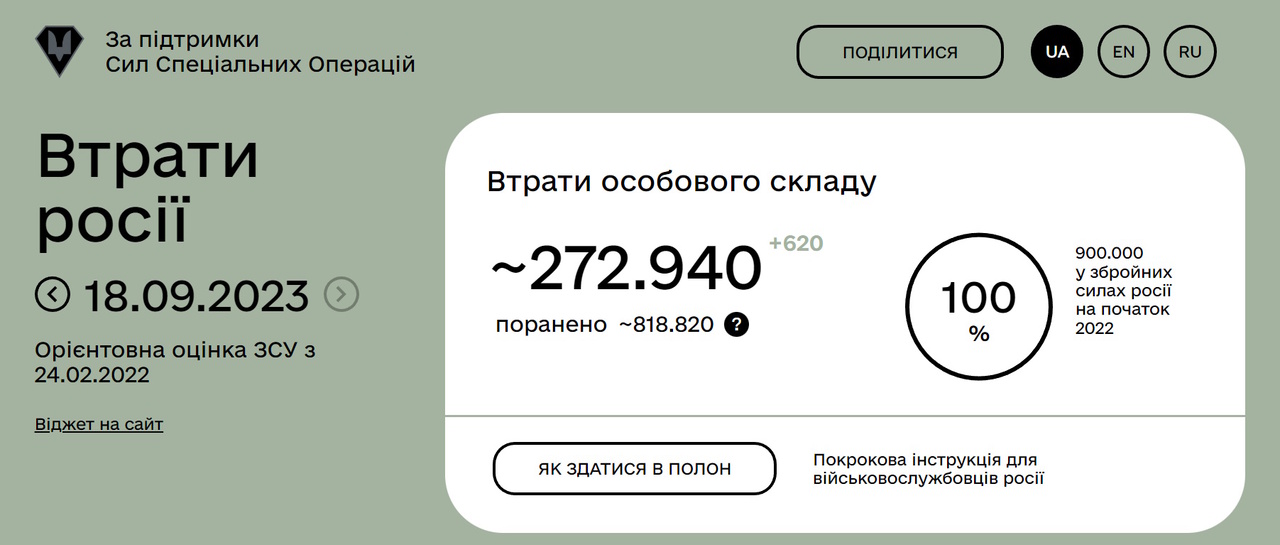 Згідно з даними сайту minusrus.com, з початку повномасштабного вторгнення в Україну загинуло понад 270 тисяч російських солдатів та офіцерів, поранено понад 800 тисяч. Водночас, Російська Федерація офіційно не афішує свої втрати - лише у вересні 2022 року Сергій Шойгу озвучив цифру в 5937 осіб. При цьому 21 вересня минулого року Володимир Путін оголосив "часткову мобілізацію" у 300 тисяч осіб.