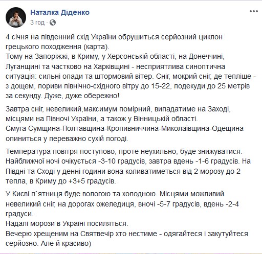 Про це на своїй сторінці у Facebook написала синоптик Наталка Діденко.
