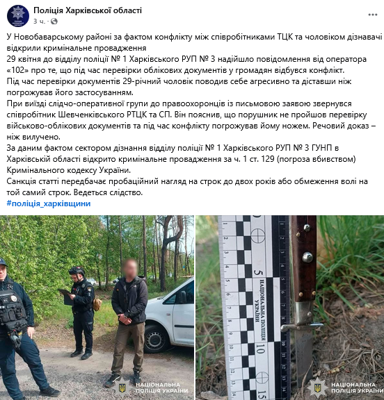 "29 квітня до відділу поліції № 1 Харківського РУП № 3 надійшло повідомлення від оператора "102" про те, що під час перевірки облікових документів у громадян відбувся конфлікт. Під час перевірки документів 29-річний чоловік поводив себе агресивно та діставши ніж погрожував його застосуванням", - повідомили правоохоронці.