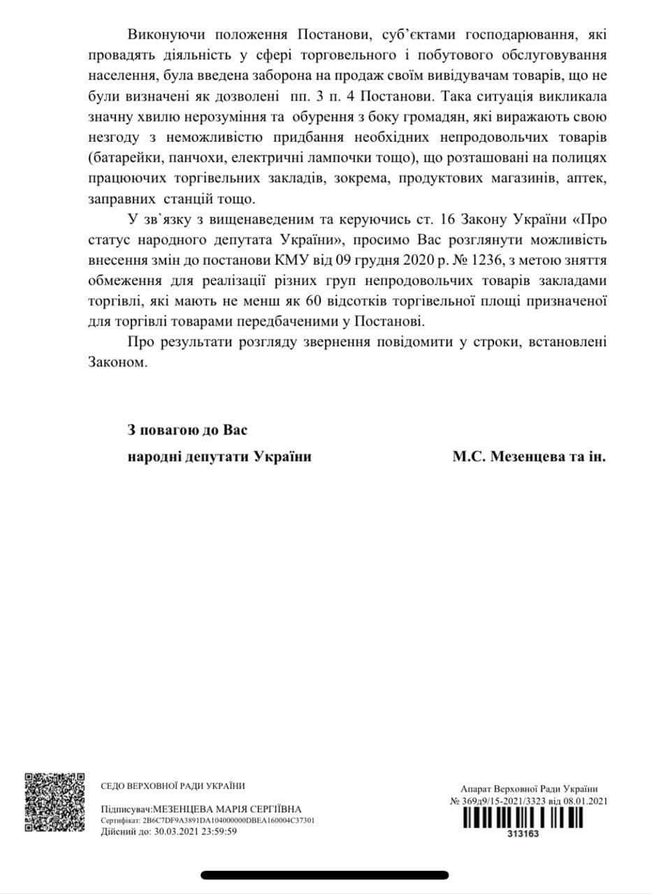 У Мережі з'явилося фото документа, який був підписаний народними депутатами України. У ньому нардепи просять прем'єр-міністра України Дениса Шмигаля дозволити продаж батарейок, панчішних виробів та лампочок.