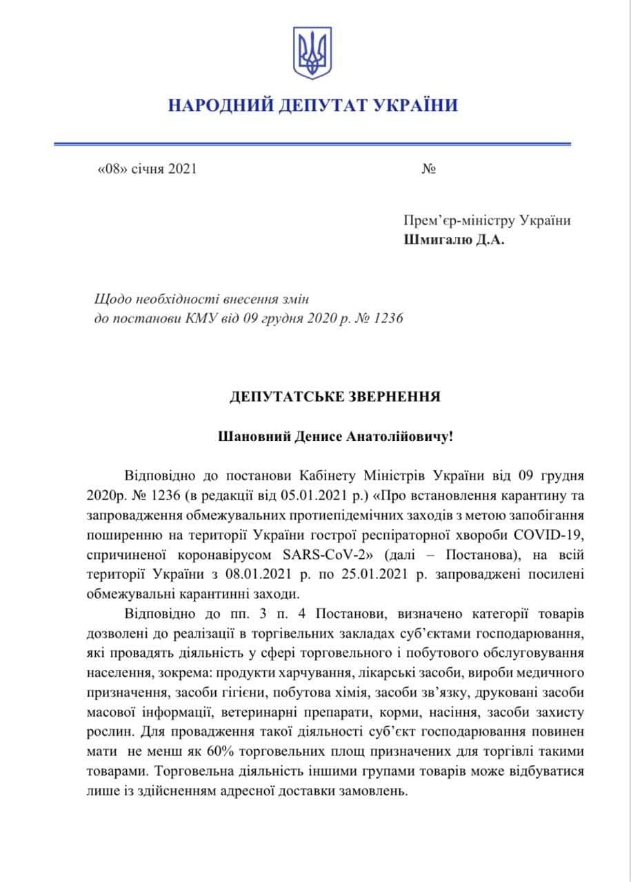 У своєму повідомленні народні депутати послалися на статтю 16 Закону України "Про статус народного депутата України" та попросили прем'єр-міністра країни Дениса Шмигаля розглянути можливість внесення змін до постанови КМУ від 9 грудня 2020 року.