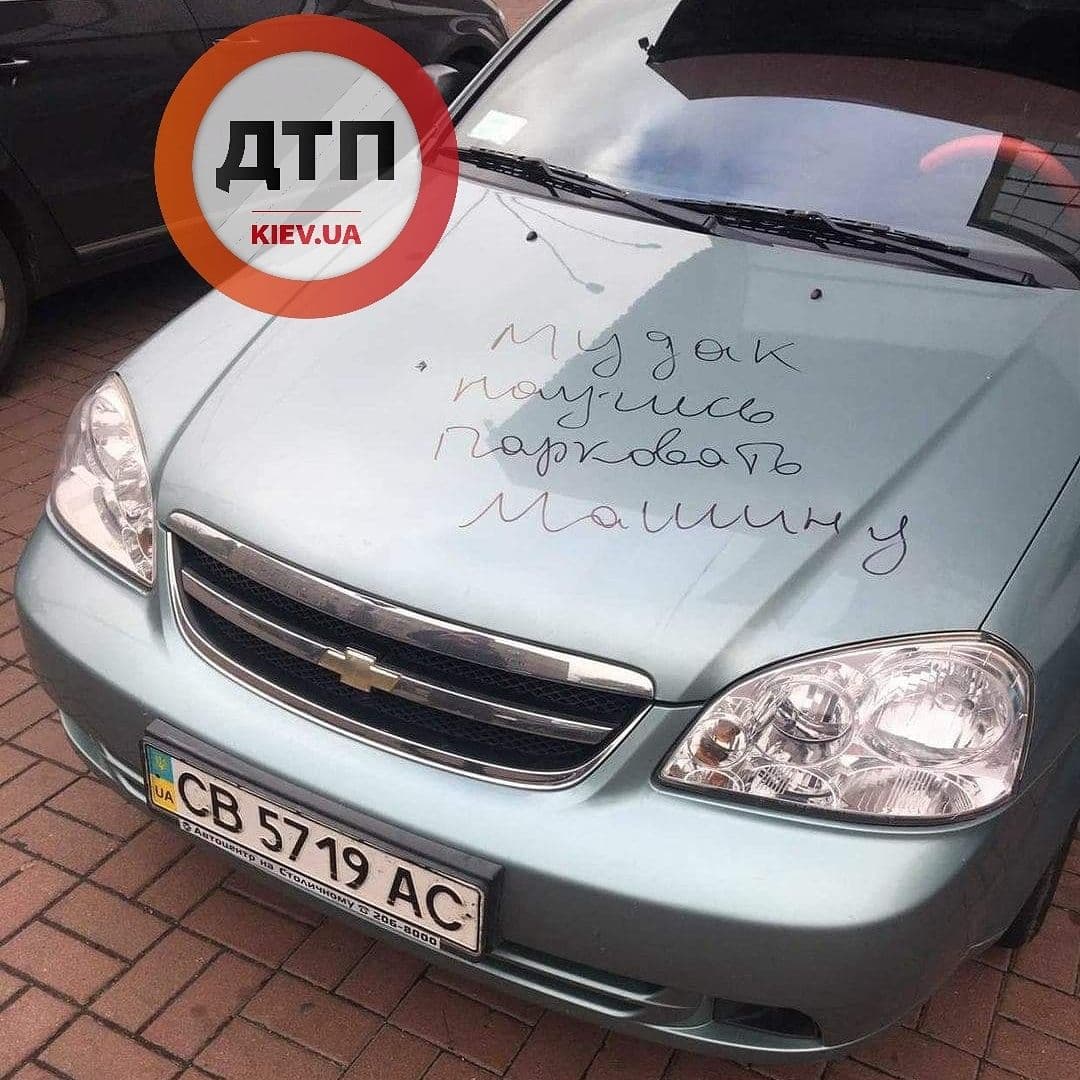 Водій транспортного засобу Chevrolet припаркувався невірно, за що і поплатився. Обурений очевидець на капоті автомобіля автохама залишив послання: "Навчися паркувати машину".