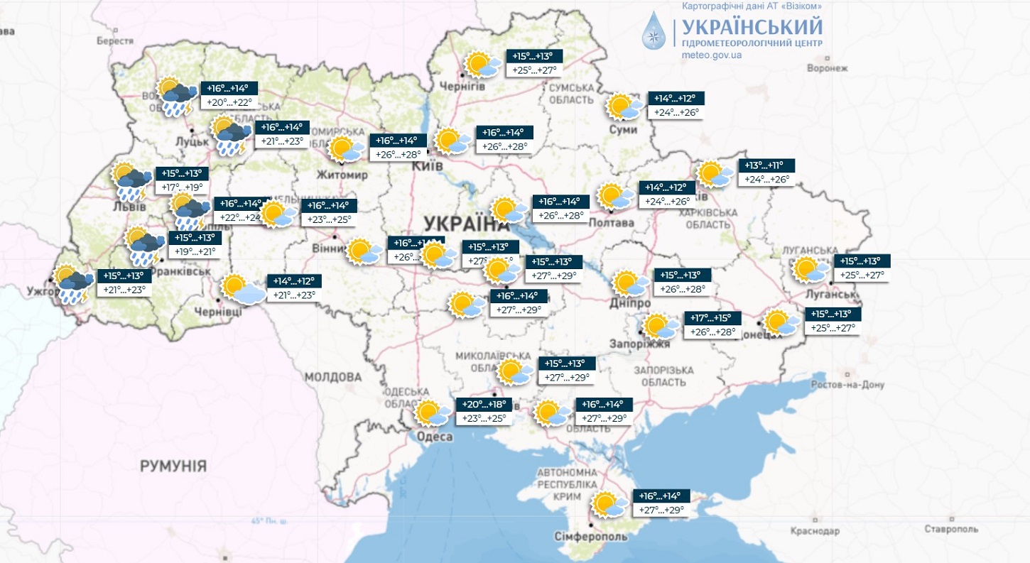 Так, у більшості областей України синоптики передають теплу погоду від +25 до +30 градусів у денний час, а у західних областях буде трохи холодніше - від +19 до +24 градуси тепла.