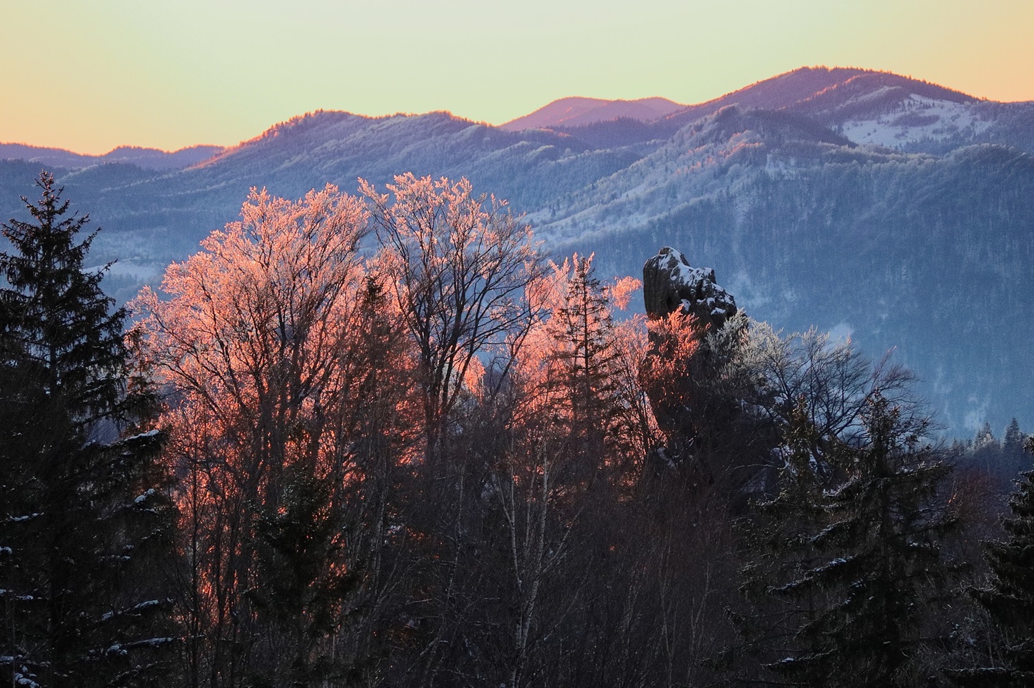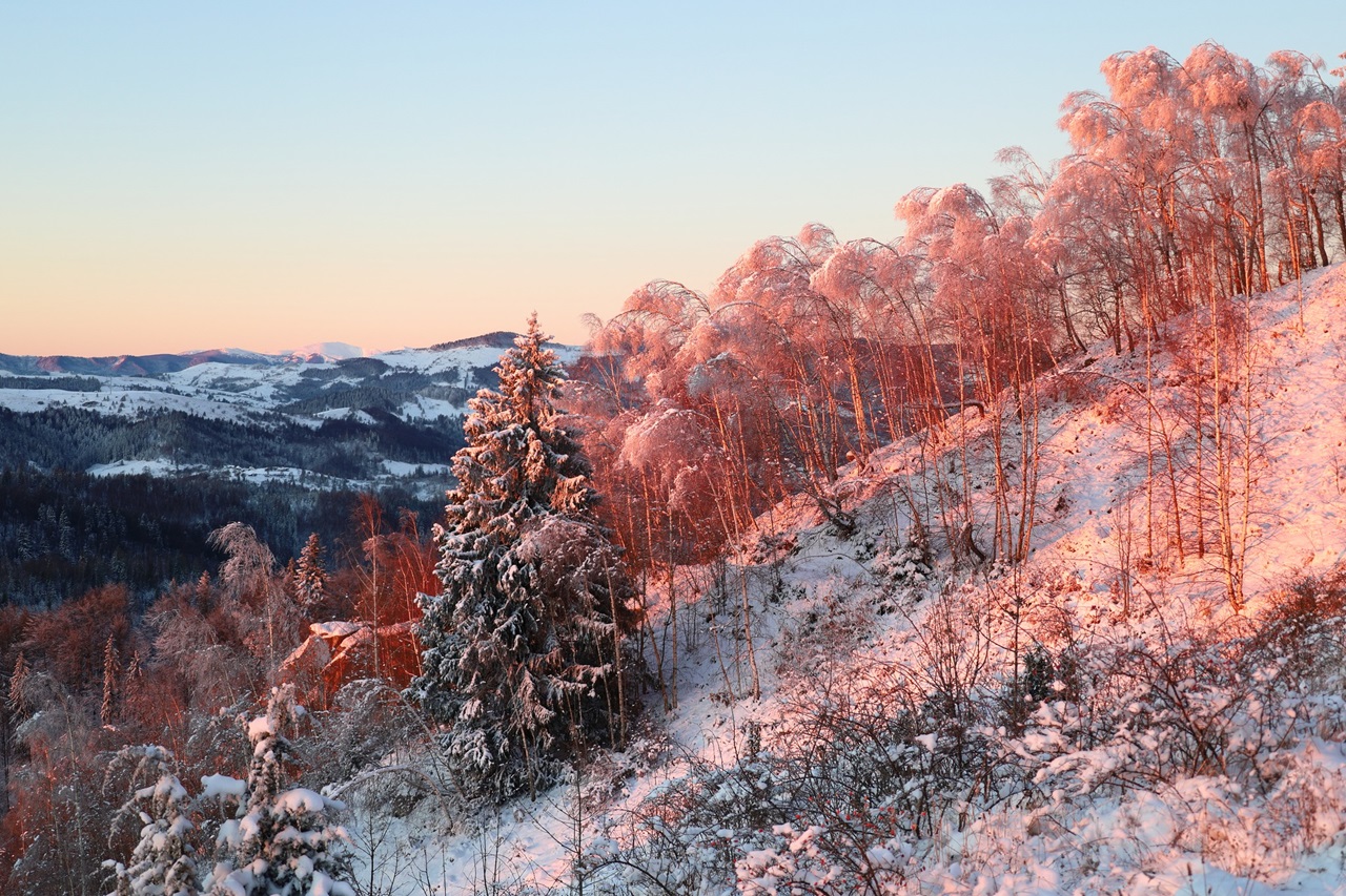 Серед величних українських гір можна розгледіти загублені будиночки. Іваночко також показав фотографії Карпат на світанку, коли природа відливається рожевим кольором.