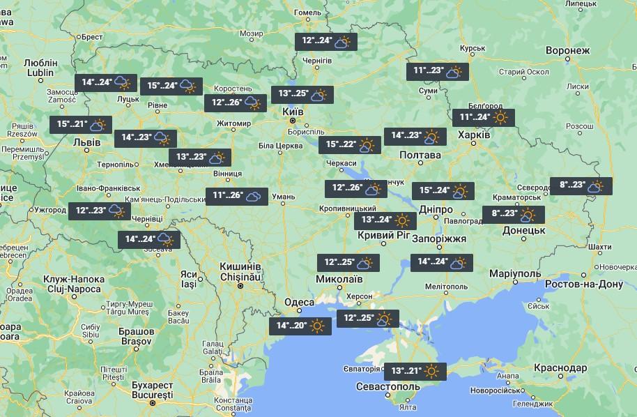 Температура повітря вночі очікується на рівні +10…+15 градусів, у східних областях +7…+12. Вітер змінних напрямків, 7-12 м/с, на заході країни подекуди пориви до 15-20 м/с. Вдень по Україні прогнозується +21…+26 градусів тепла, на Закарпатті та Прикарпатті +18…+23; у Карпатах +15…+20 градусів. Опади можливі у західних областях України. На решті території дощі не прогнозуються, проте очікується мінлива хмарність.