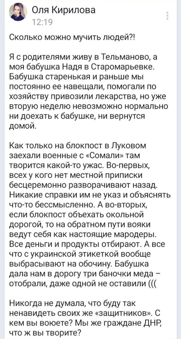 "Бабуся дала нам в дорогу три баночки меду - відібрали, навіть однієї не залишили. Ніколи не думала, що буду так ненавидіти своїх же "захисників". З ким ви воюєте? Ми ж громадяни ДНР, що ж ви творите", - пише прихильниця сепаратистів.