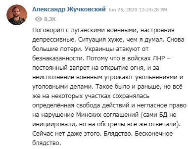 Про це пише бойовик ДНР Олександр Жучковский в своєму Telegram-каналі.