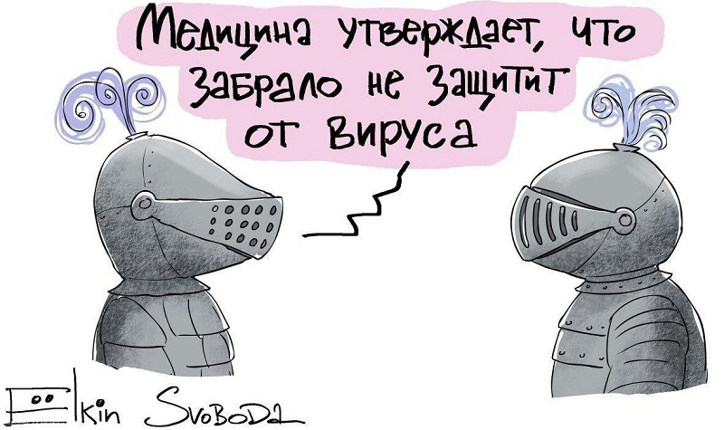 Так, автор висміяв недавно офіційно опублікований факт, який і раніше був відомий, про те, що марлева маска не може зупинити зараження коронавірусом. Художник намалював двох лицарів в обладунках, які обговорюють, чи достатньо вони захищені від епідемії.