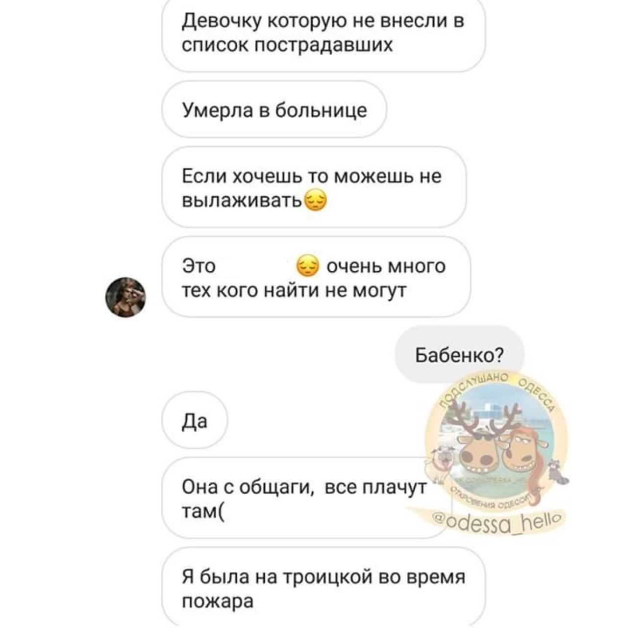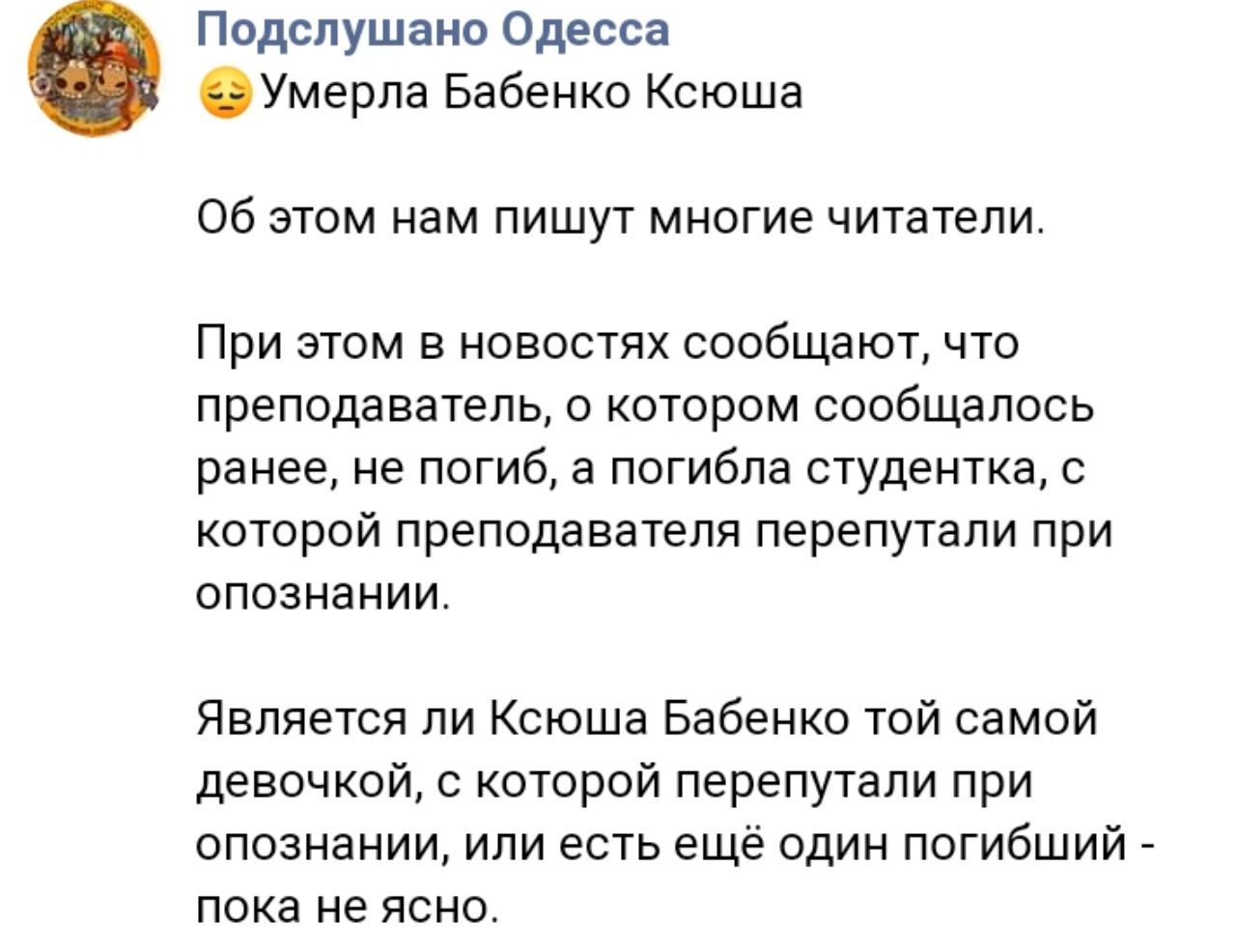 Ксенію Бабенко переплутали з викладочкою коледжу Анною Бордюк. Остання не загинула, а знаходиться у першій міській клінічній лікарні Одеси в тяжкому стані. Інформацію підтвердила прес-служба Одеської мерії.