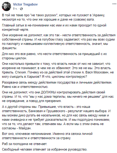 "Головний затик в нерозумінні нас ними і їх нами проходить за однією конкретною рисою. Вони щиро не доганяють, як це так - нести відповідальність за дії своєї країни. І на блакитному оці висувають, що раз ми всіх судимо за паспортом і навішуємо колективну відповідальність, значить, ми фашисти. Для них це все одно, що нести відповідальність за циклон, який прийшов із їхнього боку. Вони настільки звикли до того, що влада ніяк від них не залежить, що щиро не розуміють, в чому ж їх звинувачують. Це ж не ми. Це влада. Кремль. Стихія. Чому через дію цієї стихії я, Вася Московін, не можу з'їздити до Харкова? Я що, циклони контролюю? Розірвано зв'язок між діями держави і особистими діями. Так само як і відповідальністю. Вони не доганяють, що вони ПОВИННІ контролювати дії своєї країни. І те, що "ми у нас вдома терпіли, ми нічого не вирішуємо" для нас не виправдання, а привід для презирства", - написав блогер.